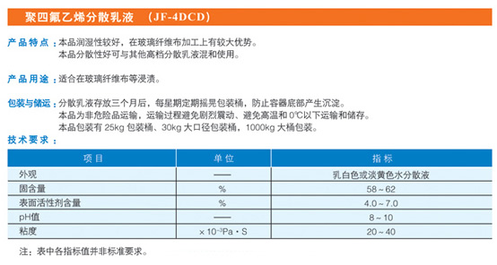 本品润湿性较好,在玻璃纤维布加工上有较大优势。本品分散性好可与其他高档分散乳液混合使用。固含量:58-62%;表面活性剂含量:4.0-7.0%; PH值:8-10;粘度:20-40。