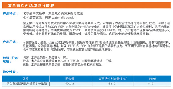 聚全氟乙丙烯浓缩分散液由四氟乙烯与六氟乙烯共聚而成,以非离子表面活性剂稳定的水相分散,可赋予通常无法用传统方法加工的FEP树脂制品的一些独特性能,其乳液中的树脂是真正的热塑性塑料,具有典型的氟树脂的优异特性:持续使用温度为200,最高使用温度到240,对几乎所有的工业化学品和溶剂显示化学惰性。其制品具有优良的耐温、耐腐蚀性,优异的化学惰性,良好的电绝缘性和低磨擦系数。固含量:50±2%;表面活性剂含量:5±2%; PH值:8-9。