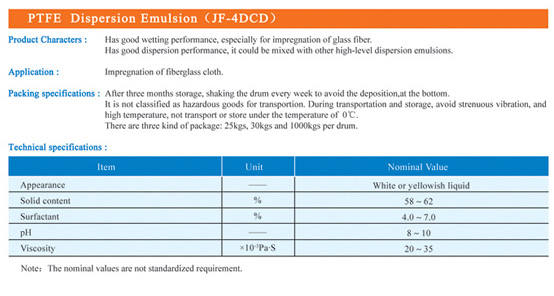 Has good wefting performance,especially for impregnation of glass fiber. Has good dispersion performance,it could be mixed with other high-level dispersion emulsiones. Appearance:White or yellowish liquid; PTFE content:58-62%; Surfactant:4.0-7.0%; PH:8-10; Viscosity:20-40。