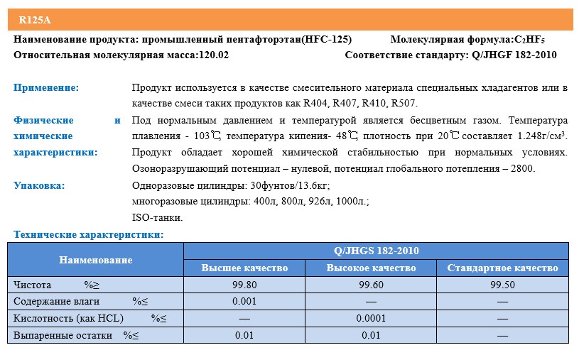 Химическое наименование   Промышленный пентафторэтан(HFC-125)
